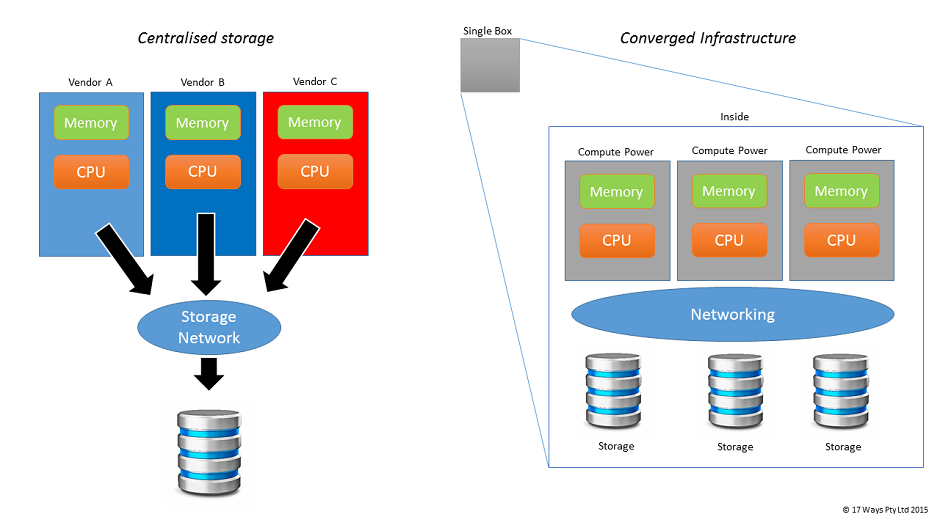 With Hyper-converged, the technology components are physically brought together on the one physical unit / element. In other words Hyper-converged tends to be based on a physical compute blade that contains physical storage and network components. It may also contain additional hardware components housed on the blade to perform functions such as data compression or de-duplication.