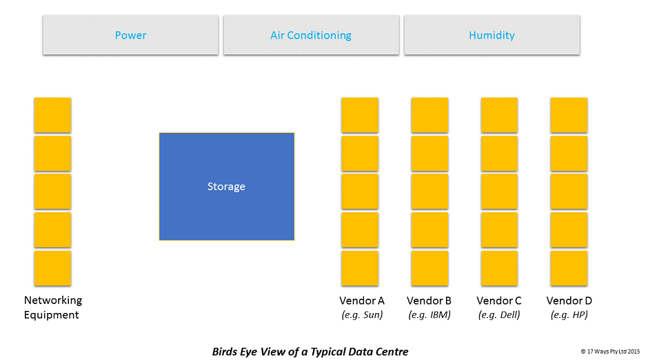 By the 90’s the Data Centre was a large room with a diverse range of equipment from different vendors. Data Centres were (and still are) expensive to run. They need a constant temperature, backup power supplies and secured access. Systems from different vendors didn’t generally interoperate, leading to duplication and “islands of technology”. So if you had a spare component like a CD-ROM or a memory chip then you couldn't use that in any of the other equipment in your Data Centre.