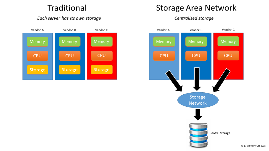Because this stuff was low level and not a big differentiator, the hardware vendors were more influenced by standards and Open Source, which meant that this technology could actually be shared. And if it can be shared then it doesn’t even need to be inside the same box. This led to the emergence of companies selling Data Centre storage systems. The hard drives effectively disappeared from the servers and became shared, with the data physically living on a new box in the corner of the Data Centre. Not only did this reduce cost by pooling all of the space requirements but it helped with disaster recovery as now only one system in the Data Centre needed to worry about copying data somewhere else instead of every system doing its own thing.